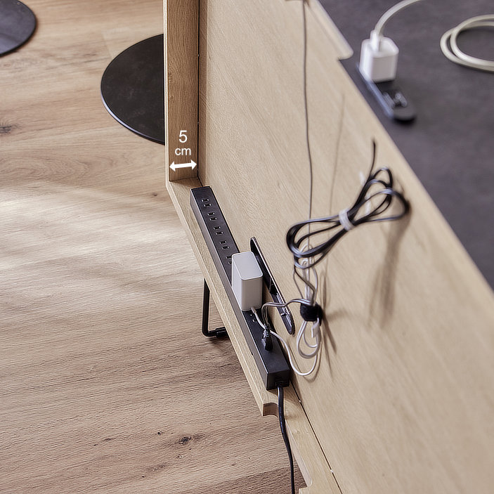 棚板の後方には配線用のスペースを設けており、充電しながらの収納が可能。