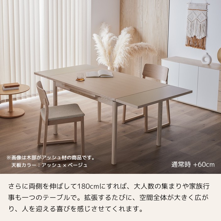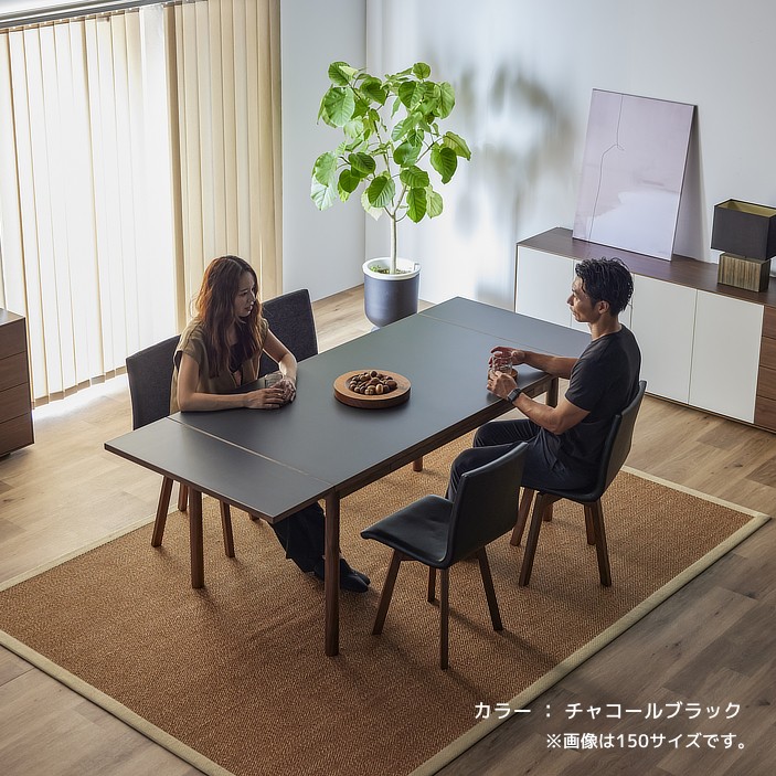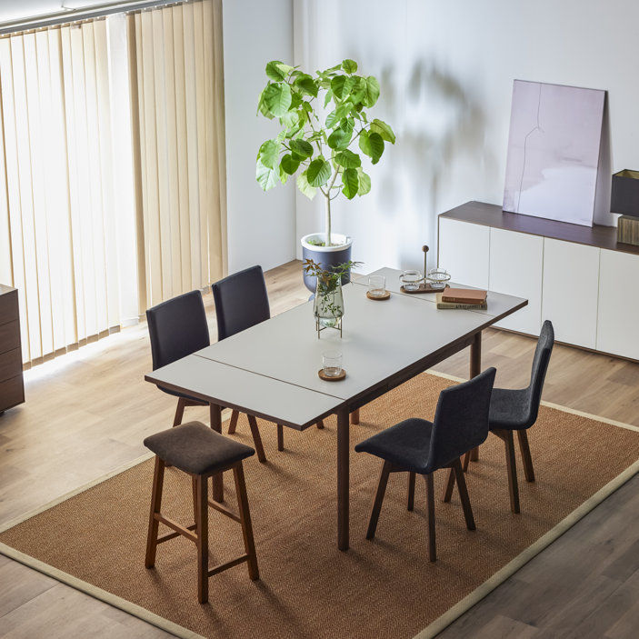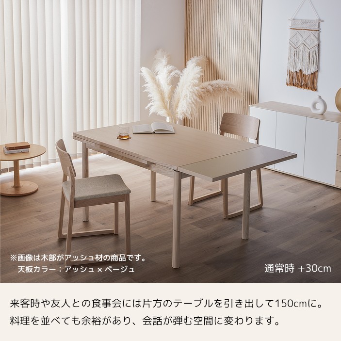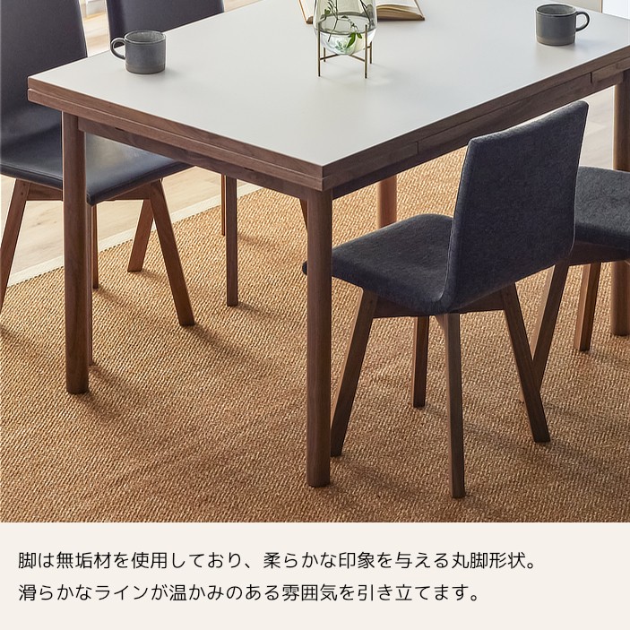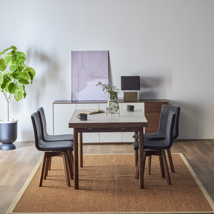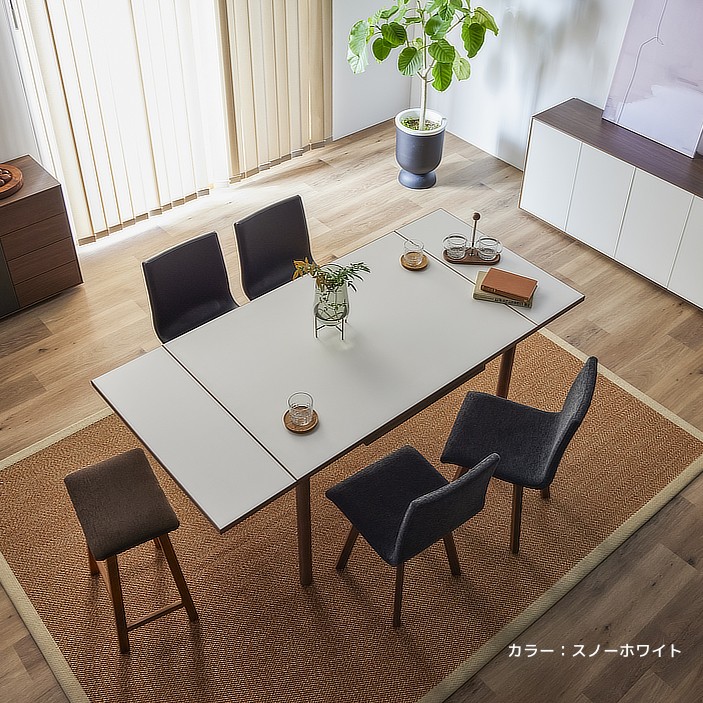 清潔感のある佇まいと、素材の美しさが引き立つ伸長式ダイニングテーブル。