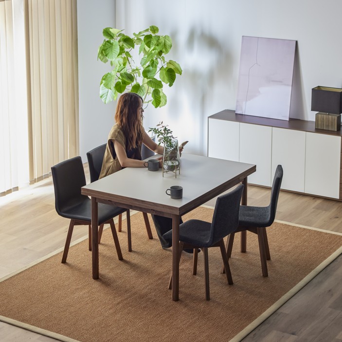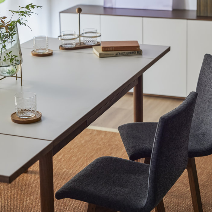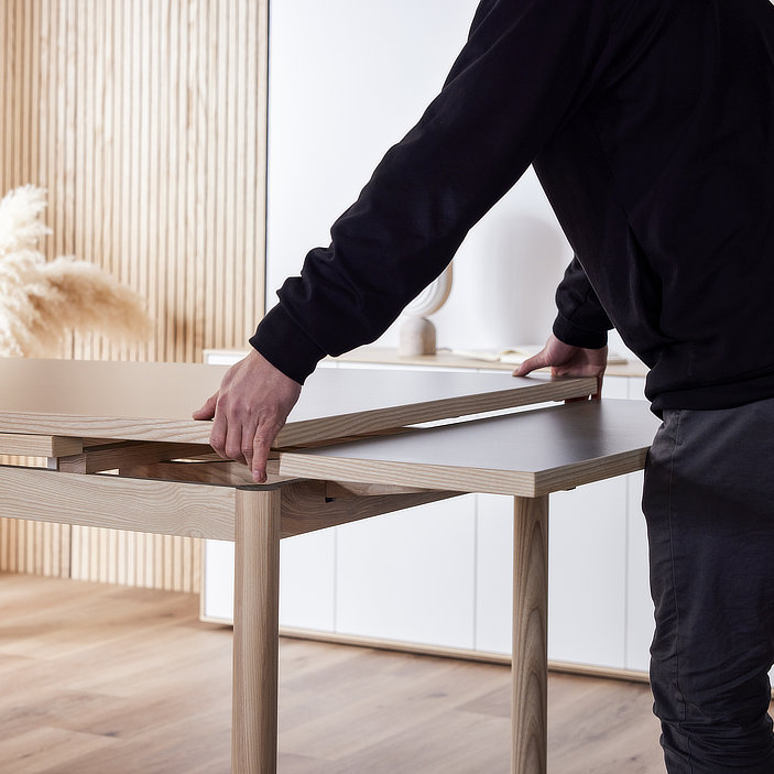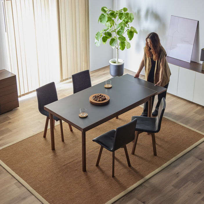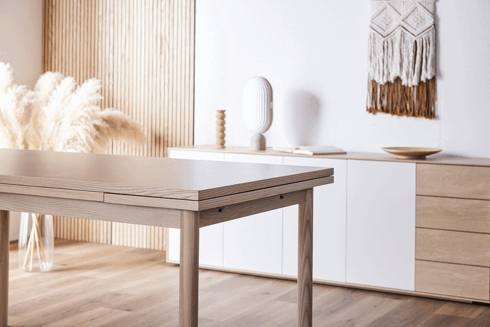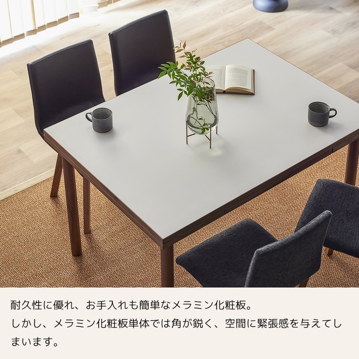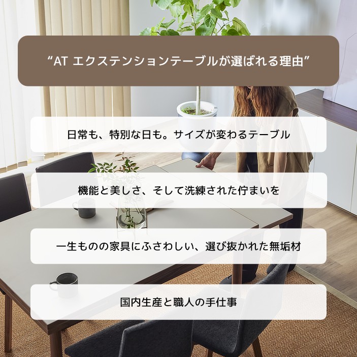 清潔感のある佇まいと、素材の美しさが引き立つ伸長式ダイニングテーブル。