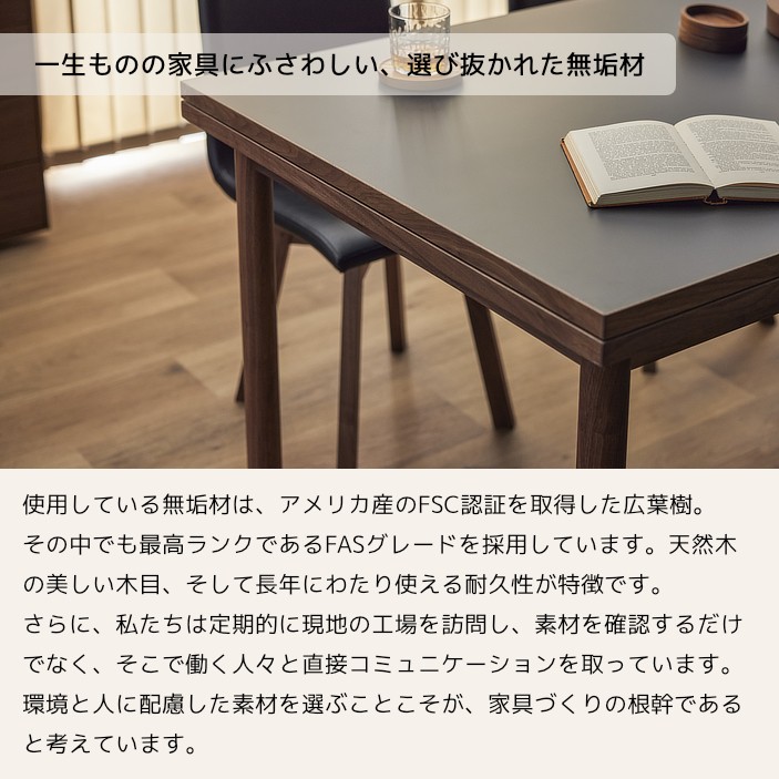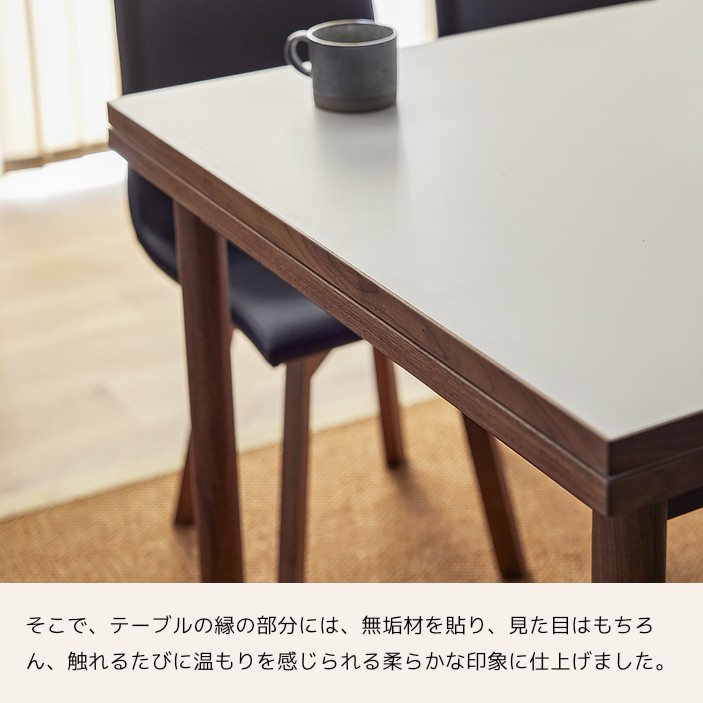 天板縁や脚、幕板にはアッシュの無垢材をあしらい、上品な木の風合いをプラスしています。