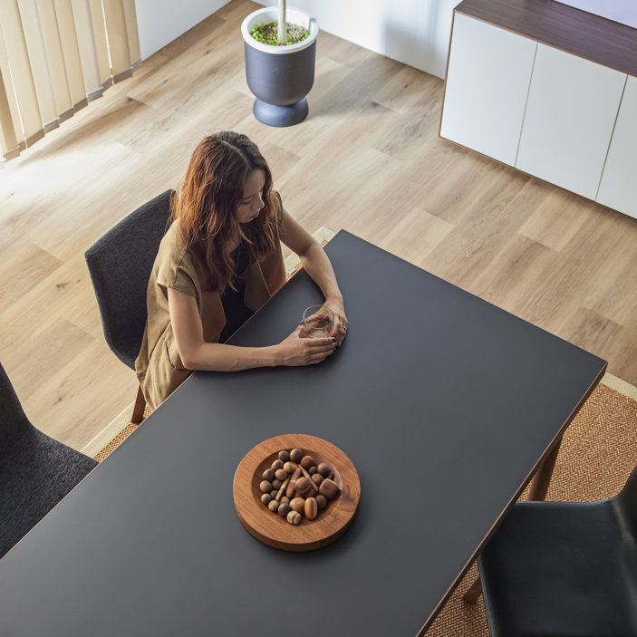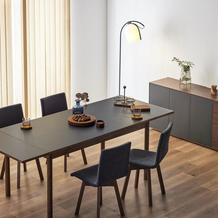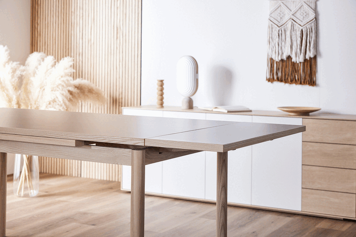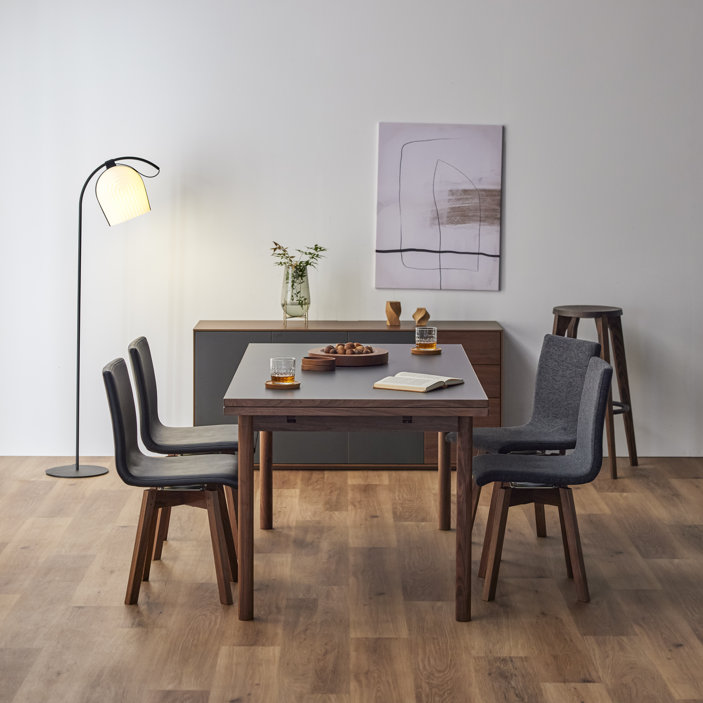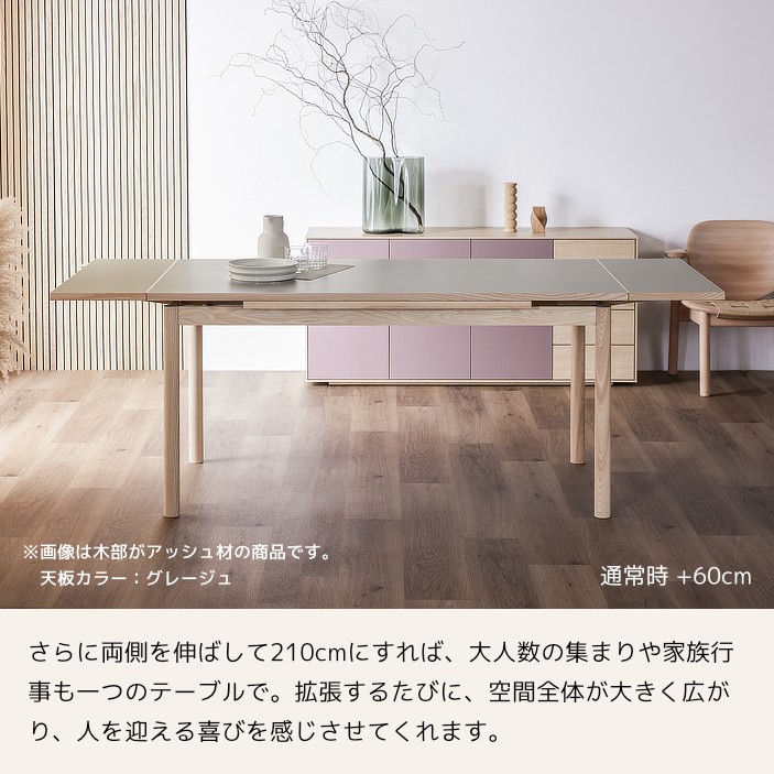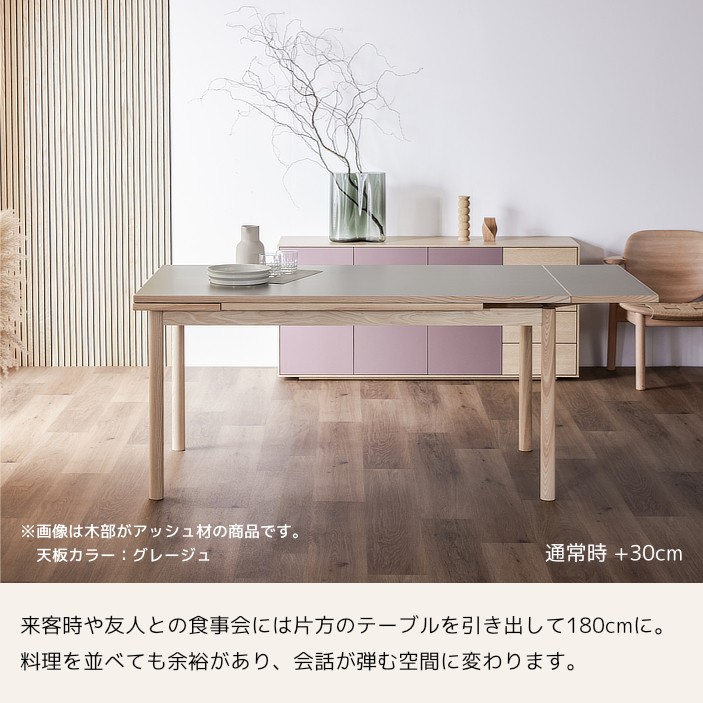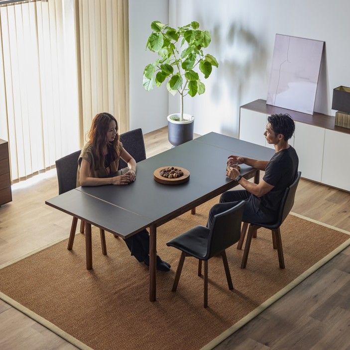 清潔感のある佇まいと、素材の美しさが引き立つ伸長式ダイニングテーブル。