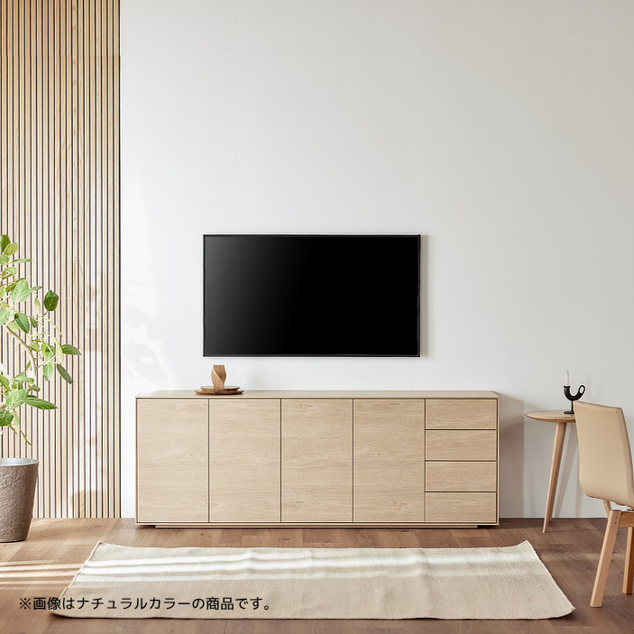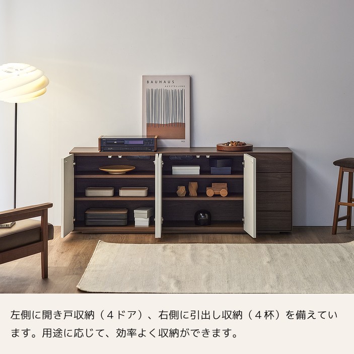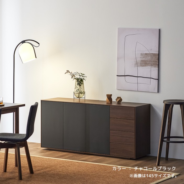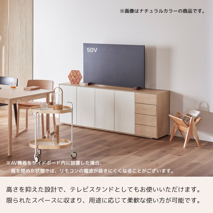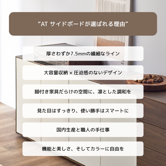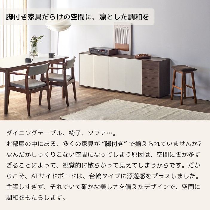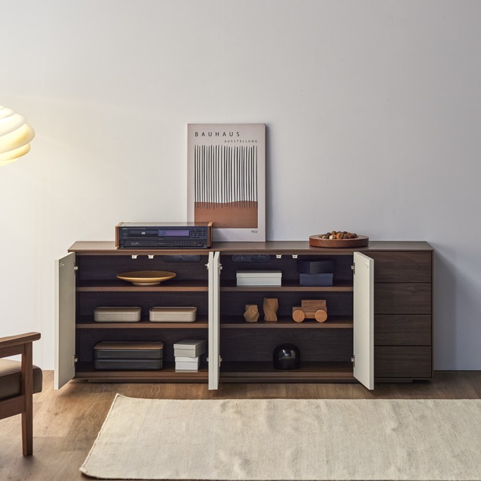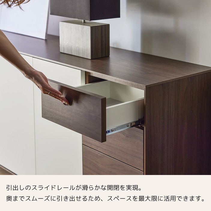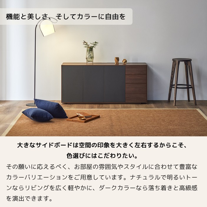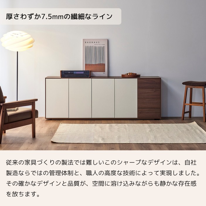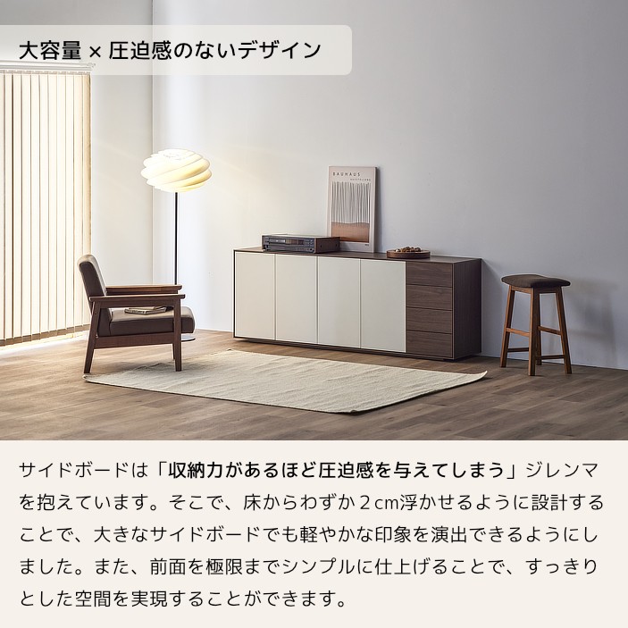 無駄のないラインと取っ手のないフラットな面の構成が印象的なサイドボード。