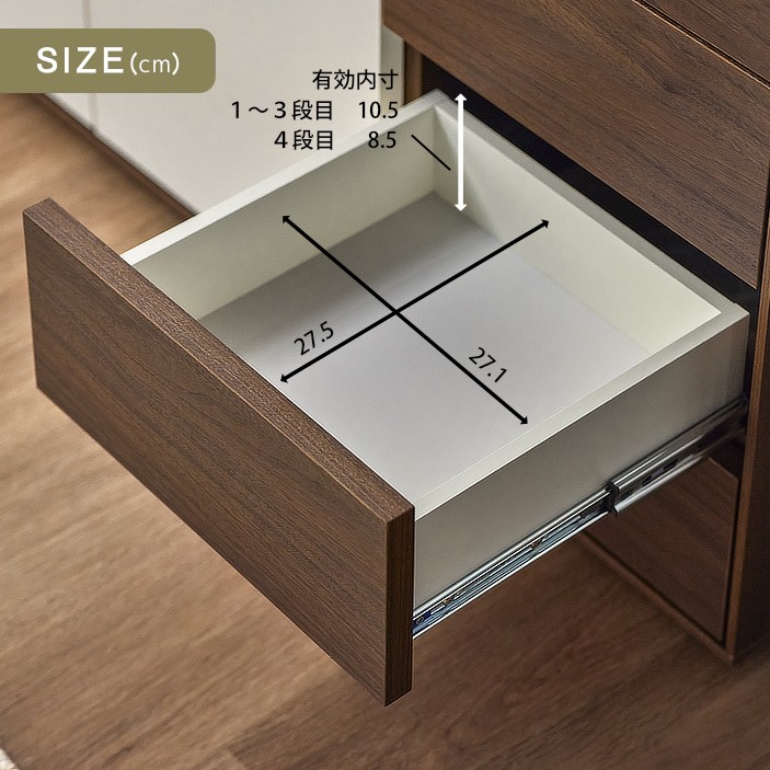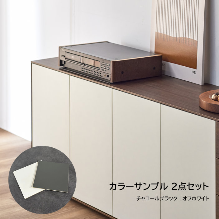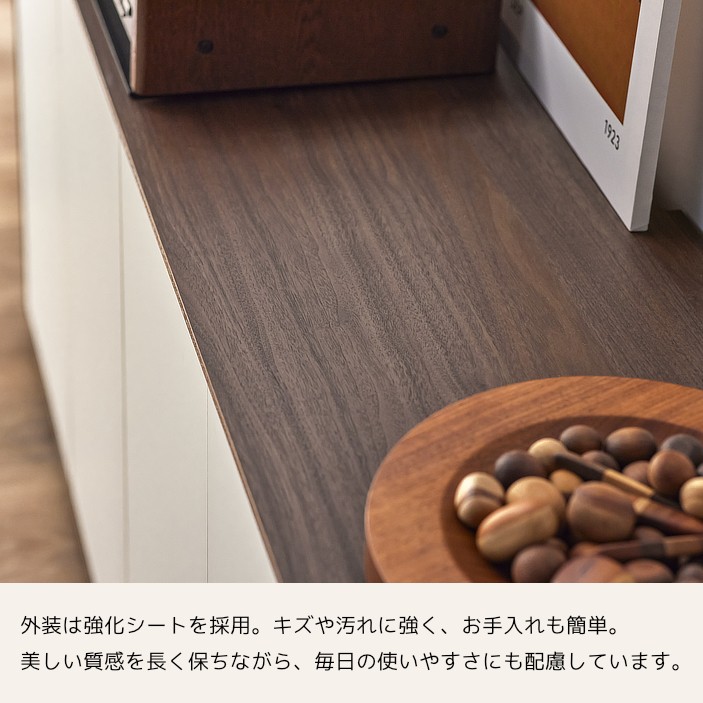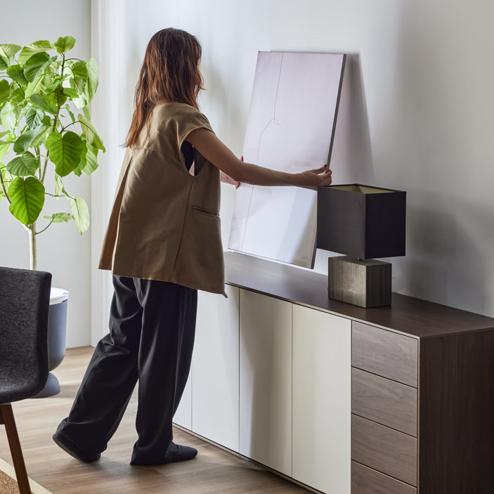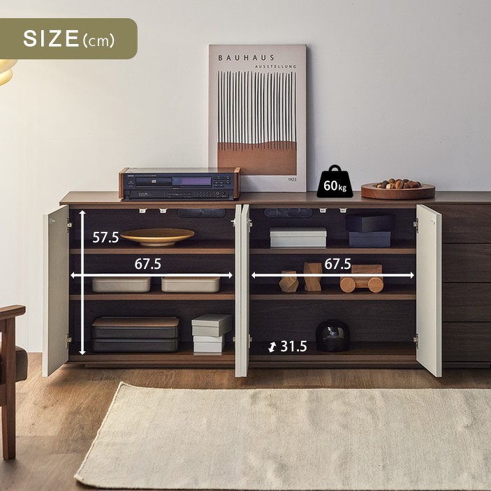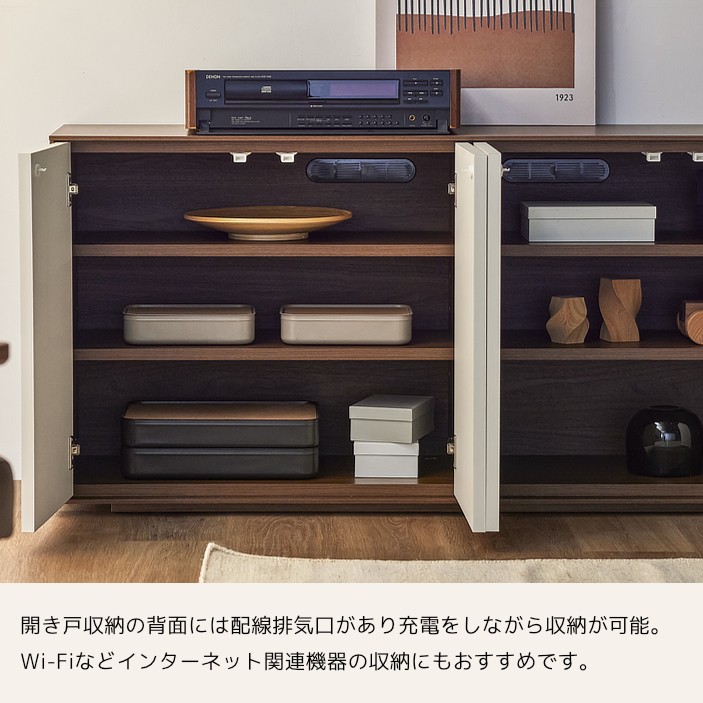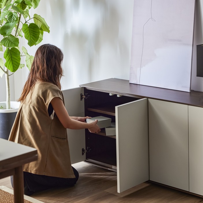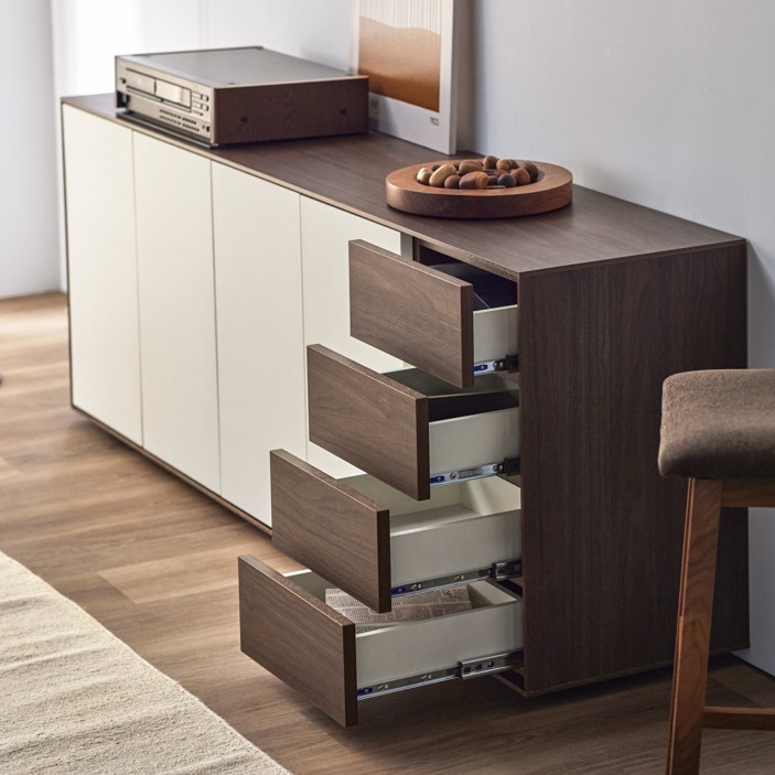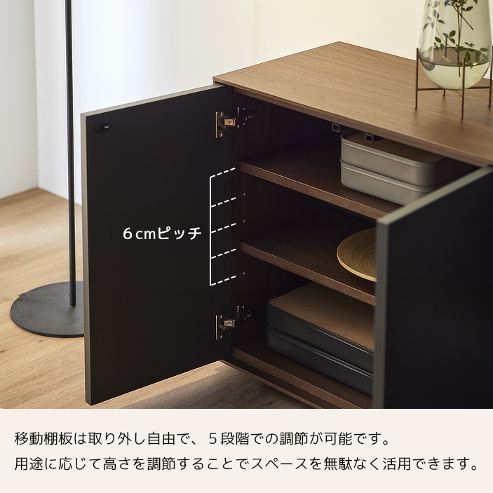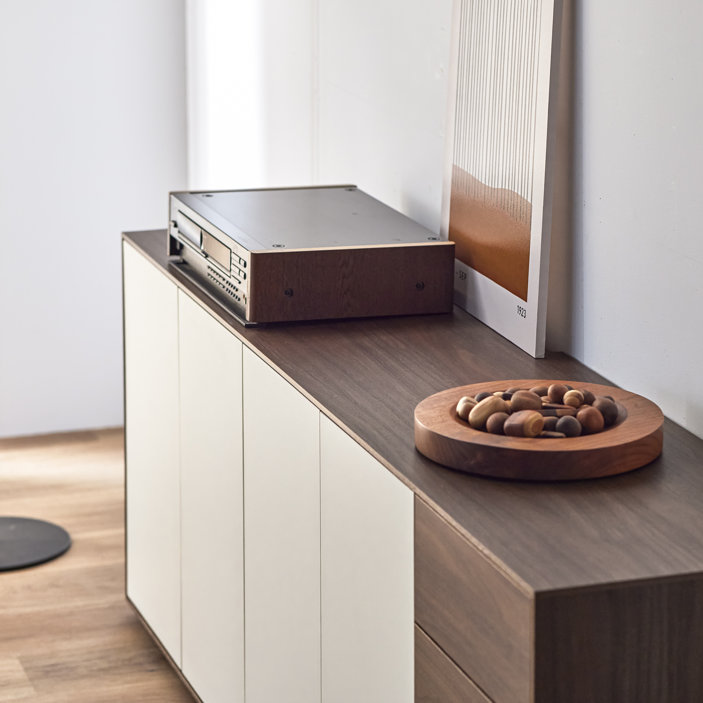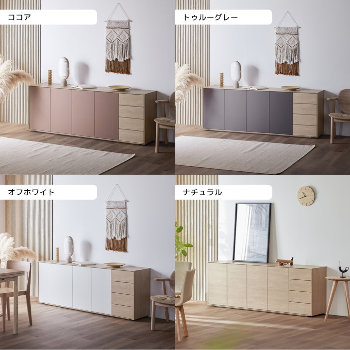 無駄のないラインと取っ手のないフラットな面の構成が印象的なサイドボード。
