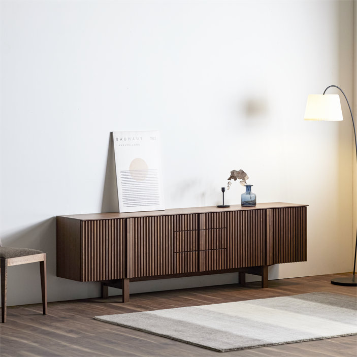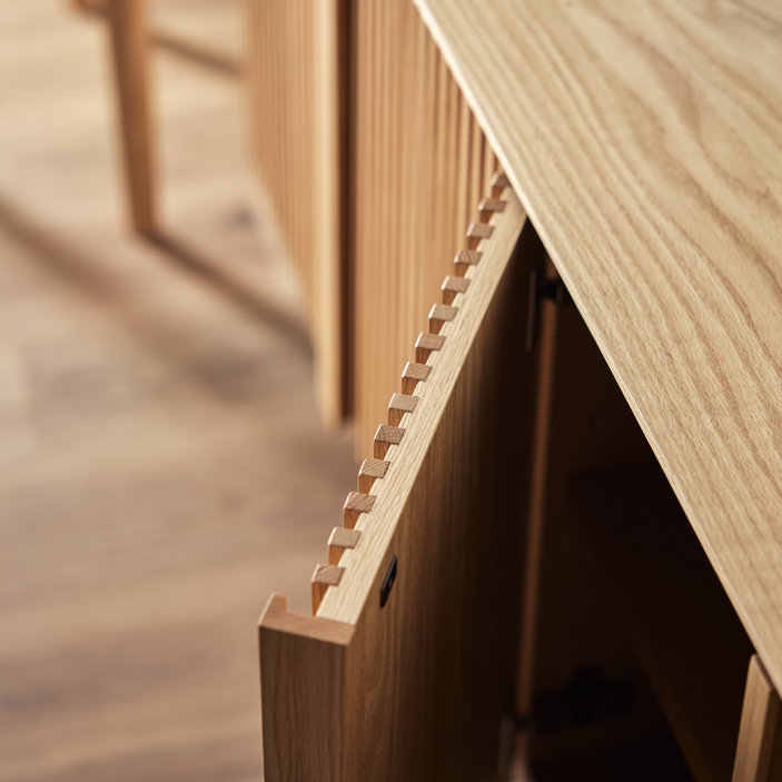 最大の魅力は、縦の桟木が描き出す端正で美しいデザインにあります。その美しさを際立たせるために、デザインの細部まで徹底的にこだわり抜きました。桟木の縦のラインをよりシャープに、美しく見せるため天板は薄く仕上げ、脚は取っ手のラインと揃えることで、視覚的な統一感と洗練された佇まいを実現しています。細部まで計算されたミニマルでモダンなデザインは、リビング空間を上質な雰囲気へと導きます。